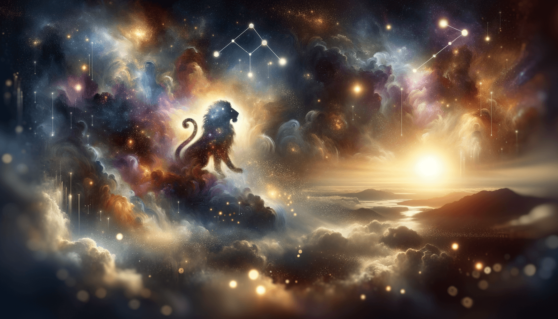 Mystical depiction of a celestial lion and a water-bearer meeting in the cosmos.
