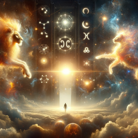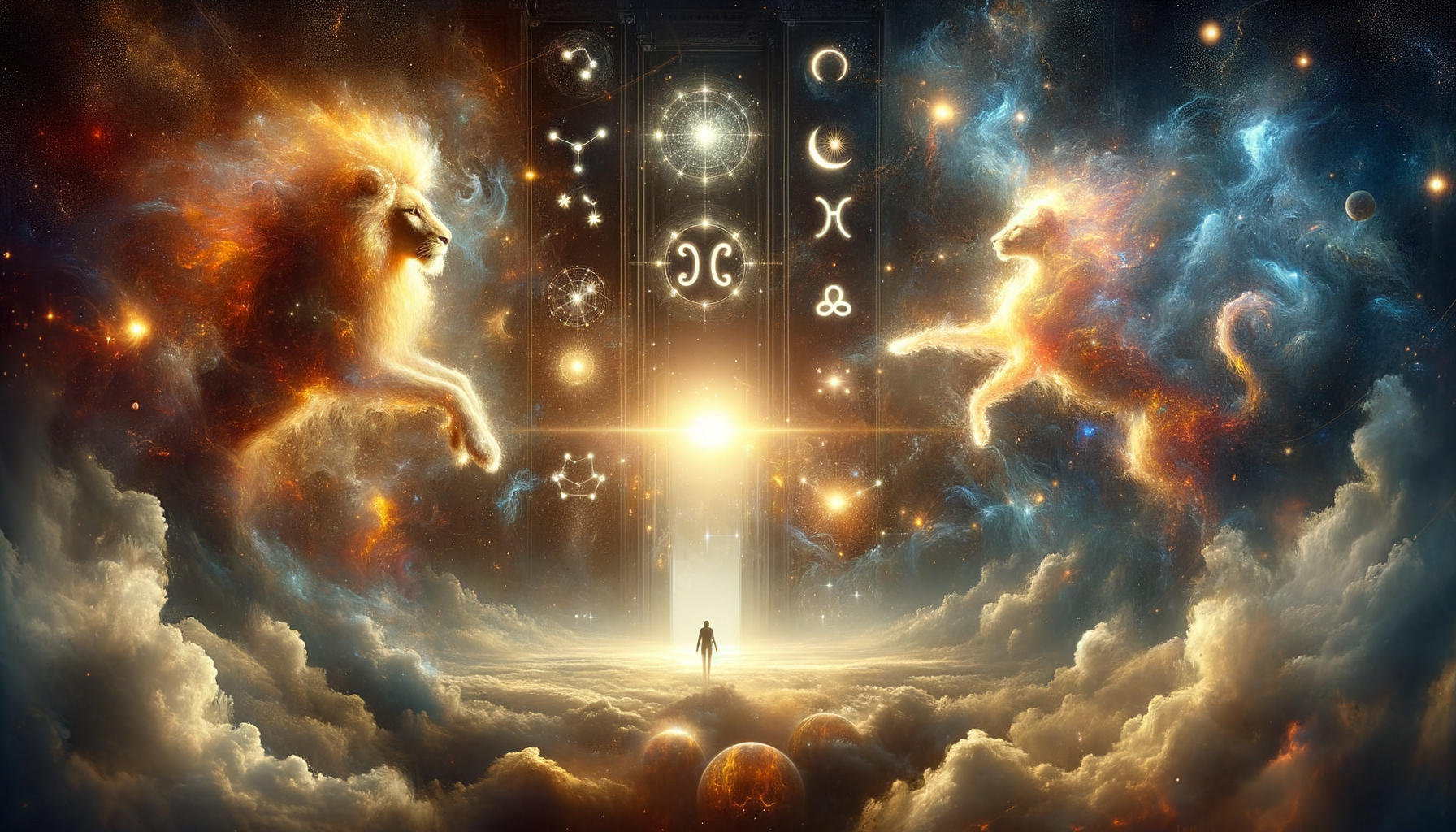 Celestial art showing a Lion and a Ram constellation as sovereign rulers of their own cosmic kingdoms